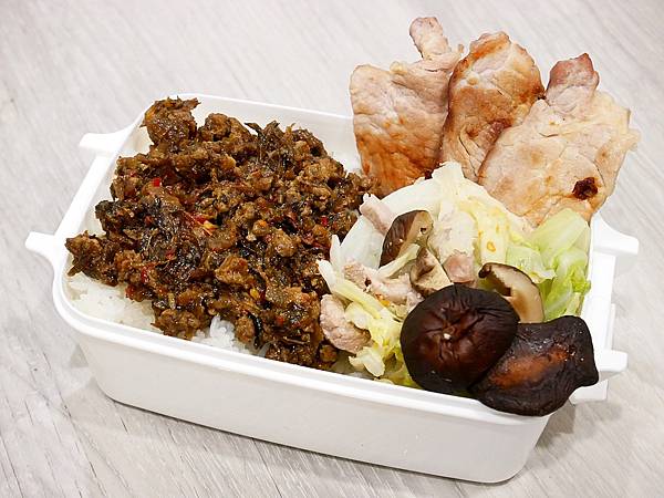 靜香的便當簡單搭配煎肉片還有炒高麗菜,這個份量女孩們都能吃飽飽,把梅干菜肉醬拌一拌每一口都很夠味,外頭買的便當都沒這個香~