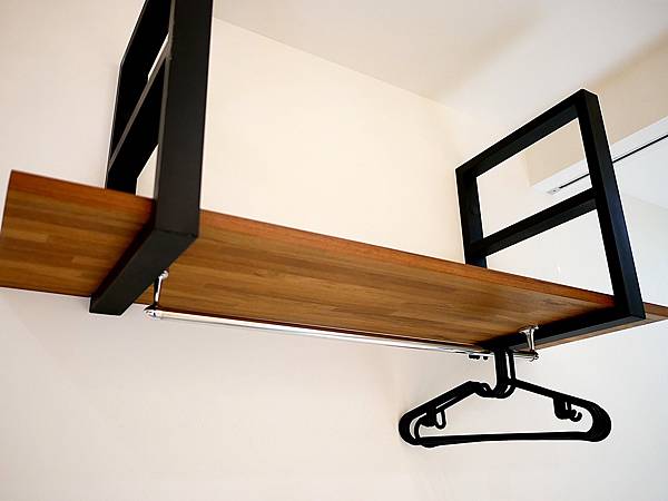 房間內沒有衣櫃,但有個木製衣架,可以掛不少件衣服,上頭還能放些帽子等等配件。