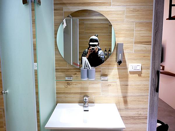 「后棧旅店」的設計很特別,除了房間的門之外,房內與浴室中間也有一個滑動的木門隔著,睡覺的時候拉上木門可以隔絕浴室窗外的聲音,而且也較不受水氣影響,像靜香男友水氣一種隔天起床就過敏,有點阻隔很重要。