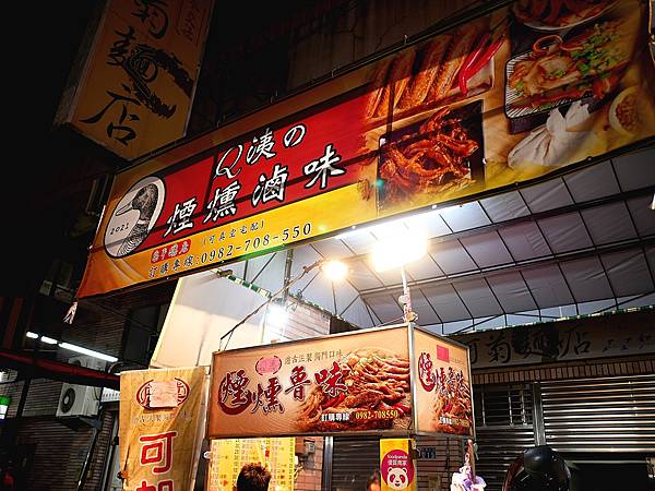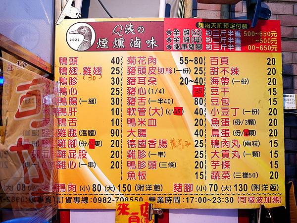 「Q洟煙燻滷味」品項還挺豐富,竟然有鴨頭、菊花肉、豬腳等等,是一般滷味店比較少見的。售價張貼在牆上,價格跟一般煙燻滷味差不多,但有些是用秤的,不確定詢問一下才不會夾超出預算。