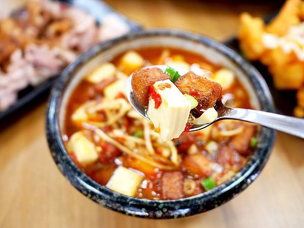 雙色豆腐包含炸過的雞蛋豆腐,豆腐表面超吸湯,麻婆醬汁香香辣辣非常夠味,但鹹度不會太高又不會太油膩,也是超級下飯又很好拌飯的一道。