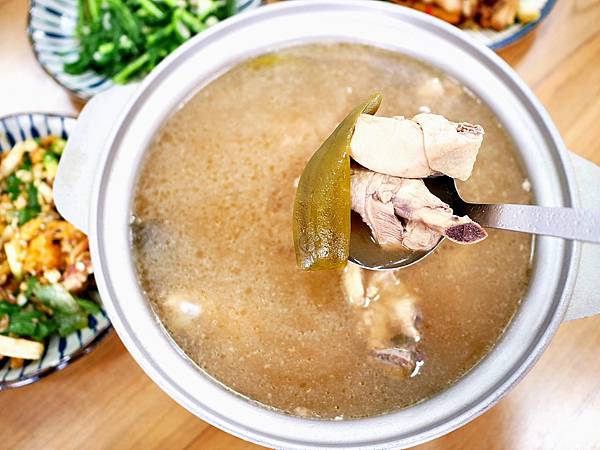 剝皮辣椒雞湯超大鍋,甘甘甜甜略帶點辣的湯頭香氣很棒,裡面還有不乾柴的雞肉和蛤蜊,更添湯頭的風味,如果有三人以上來用餐,這鍋必點。