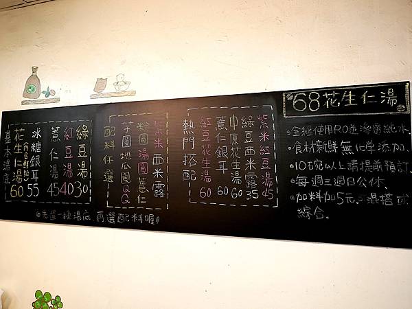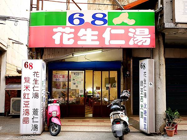不是只有人會有老成問題,店面也會有XD,苗栗在地甜品「68花生仁湯」,店小小的,而且裝潢比較復古又不怎麼醒目,如果不是靠導航完全不會留意到,GOOGLE上的評論最舊是三年前,但舊外觀來看感覺像開了30年XD 比較特別的是消費模式,5種湯底8種配料隨興搭配,玩出屬於自己的下午茶還不賴