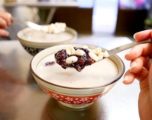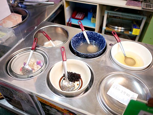 先附上菜單,老闆娘說只有花生湯和紅豆湯有熱的,先從5種湯底選一款,然後想加料只要+$5就能從8種配料裡面任挑任選,重點是配料不管選幾樣都一個價,本來想8種料通通來一點,但當天我們比較晚到,有些配料賣完,只選了紫米~