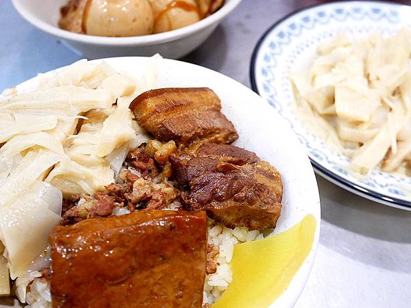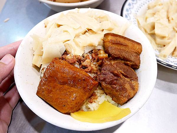 飯的醬汁跟魯肉飯香氣一樣,上頭的焢肉有點小,但味道還不錯,肉質完全不乾,口感還不錯。旁邊附了一塊豆干和筍絲,豆干滷到挺入味有加分,但我覺得本體還是焢肉,肉大塊一點比較吸引人。