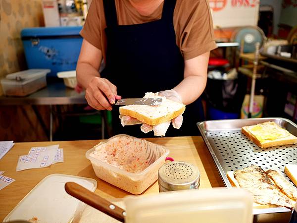 透過點餐窗台可以看到闆娘正迅速製作我點的餐,沙拉蛋和鮪魚蛋都是較濕潤的質地,抹上厚厚一層超有料~