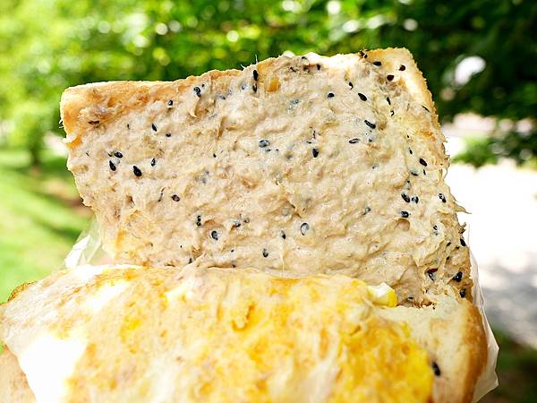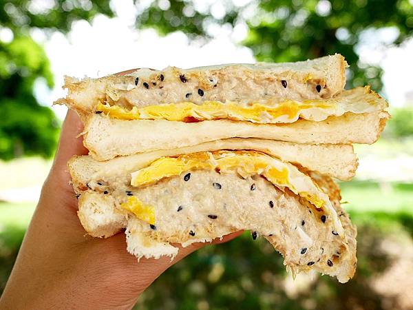 超喜歡店家的鮪魚蛋吐司,拌了沙拉和黑芝麻的鮪魚醬吃起來不會有太油膩的厚重感,鮪魚的量給不少,抹了厚厚一層,大口咬下除了吃到鮪魚塊,還能咬到芝麻的脆度和香氣很加分。