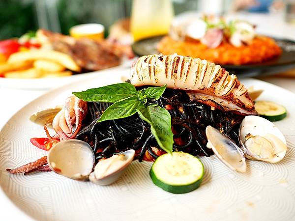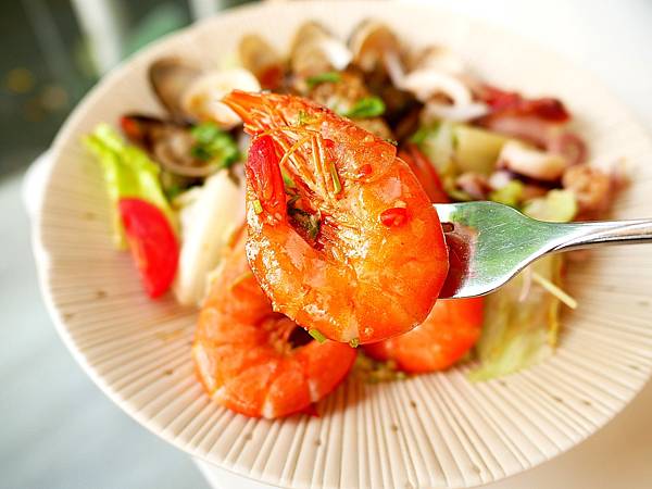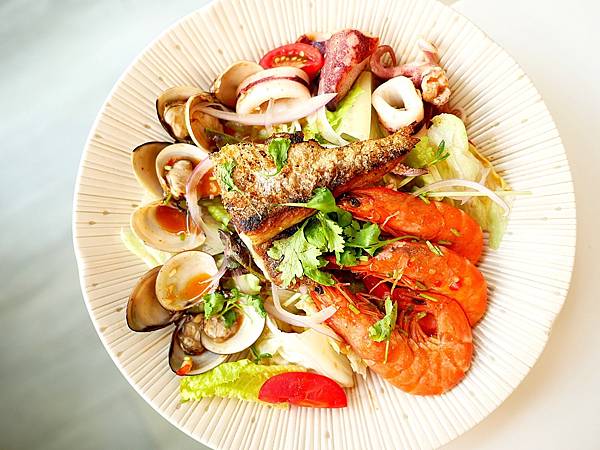 海鮮沙拉的份量還不小,喜歡吃沙拉的朋友很適合點一份大家一起分享,除了底下滿滿新鮮生菜之外,海鮮的種類也很豐富,頭一次看到搭配煎魚排,竟然意外合拍,餐點剛上桌還很擔心魚肉會很乾,因為表面看起來煎到很酥脆,沒想到魚塊挺有厚度而且肉質不乾澀,調味剛好沒有蓋掉魚肉的香氣,蝦子、中卷、蛤蜊也都很新鮮,淋上的泰式酸辣醬汁味道很足但不會太厚重,整體來說夠味又不失清爽,很適合炎熱的夏天。