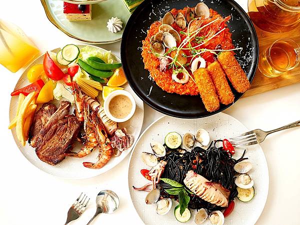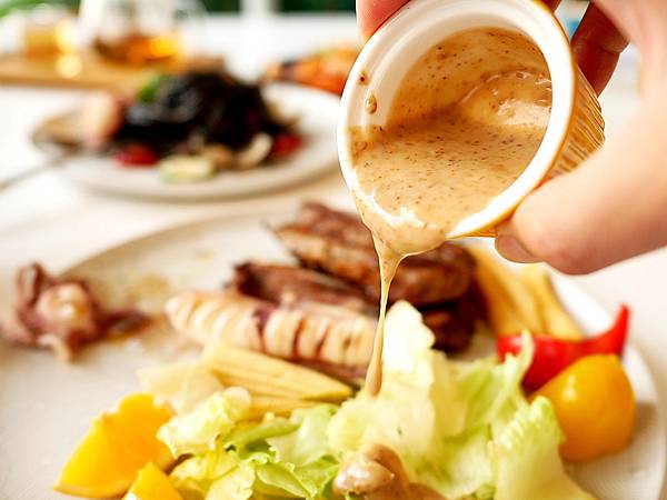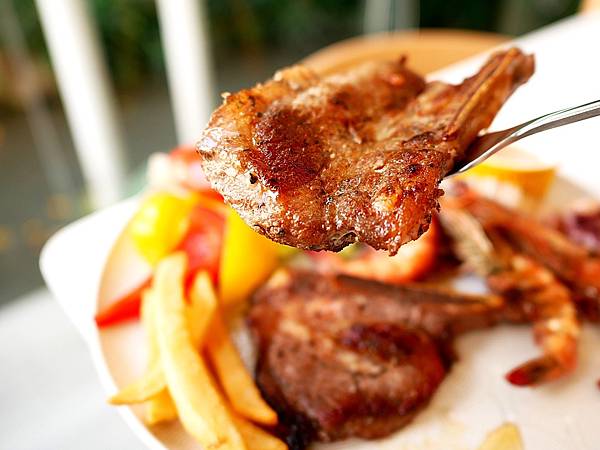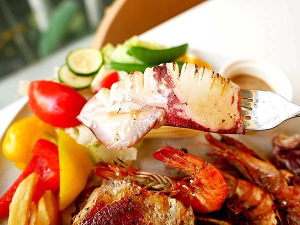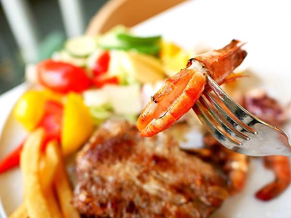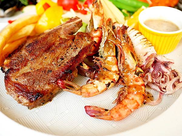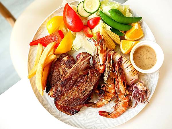 「林森67」的海陸餐相當豐盛,有戰斧豬排、中卷和大隻烤蝦,旁邊還搭配了新鮮蔬果和薯條,不只份量足,對於肉控來說一樣很均衡。店家貼心準備胡麻醬用來搭配沙拉,讓蔬菜吃起來完全不單調~