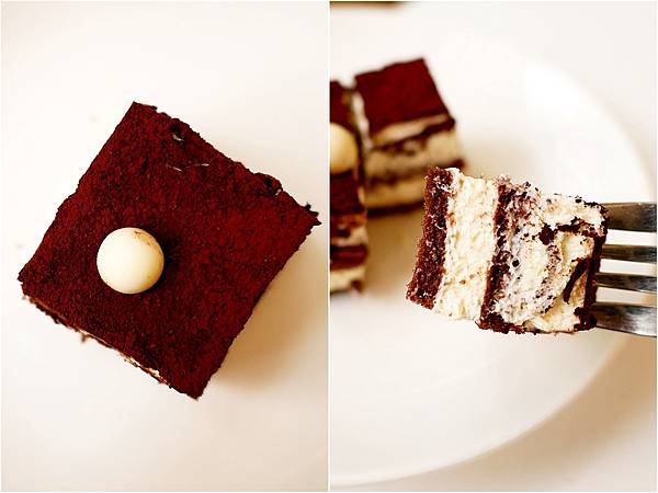 提拉米蘇方塊蛋糕相當有層次,且風味較豐富,比較不是輕盈的口感,甜度不會太高,入口帶點淡淡酒香和濃郁可可味,是較為厚實的的一款甜點。