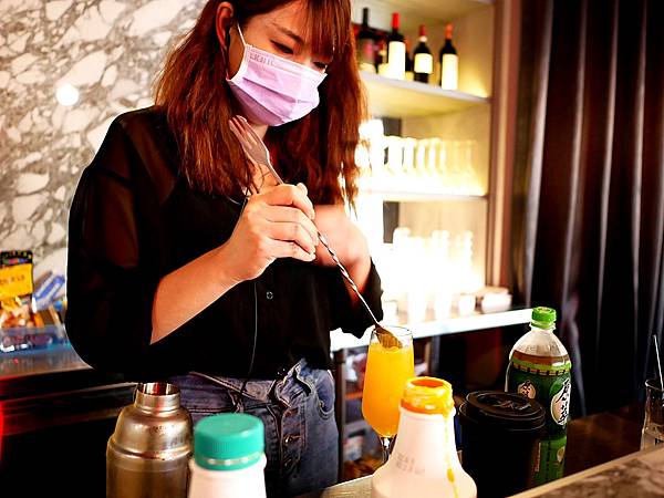 吧台區特別明亮,後頭一排排的酒瓶五彩繽紛,各種基底酒一字排開很想每種都來上一口,很幸運捕捉到調酒師正在調我的「綠茶女王」。