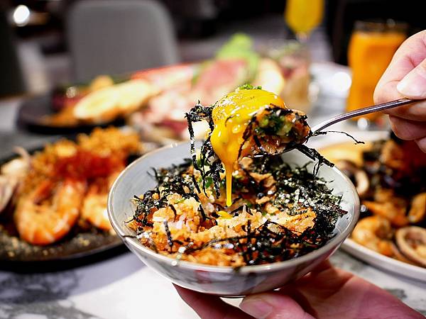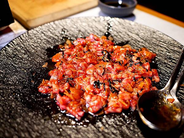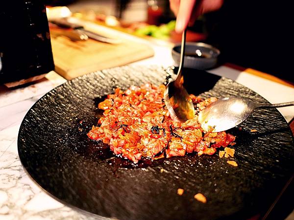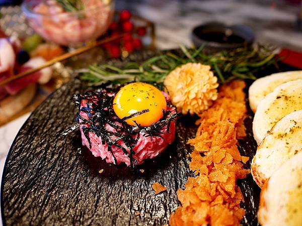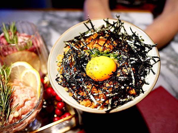 這是道讓人驚喜的前菜,使用冷藏日本A5和牛丁+澳洲M9和牛丁拌入胡麻油燒肉醬、生食級靈芝蛋、海苔絲及炸餛飩皮,吃法很有特色。
