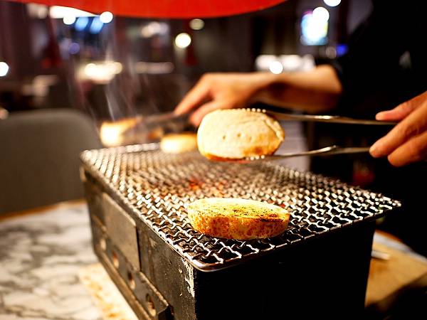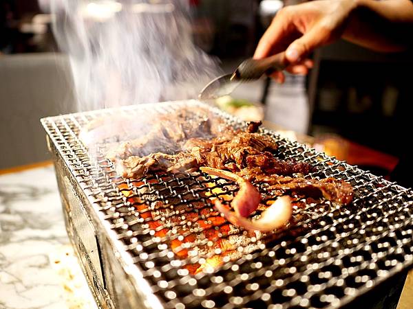 不同於一般燒肉店採用內嵌式的烤台,「Eartha燒肉餐酒館」選用可移動的烤爐,並搭配木炭加熱。這款炭的出煙量不會太大,即使吃完身上也不會有很重的燒肉味,而木炭又能增添肉的香氣,很喜歡吃炭烤的燒肉,就是比瓦斯烤的還美味。當天幫我們服務的燒肉師Kim超貼心,服務很好而且相當健談,還會跟我們介紹餐點名稱由來等等,等肉的過程完全不無聊。