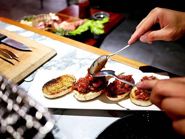 喜歡吃麵包的朋友可以加購,每片五塊錢,建議剛開始可以多加購兩片,把生牛肉平均鋪放,可以慢慢品嘗~