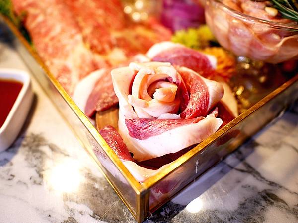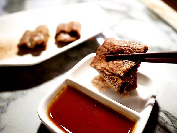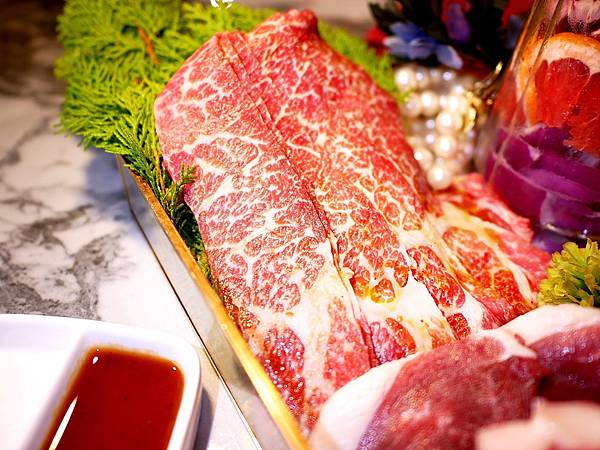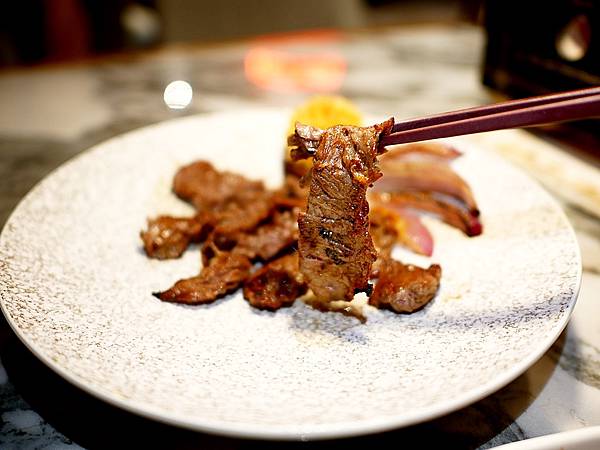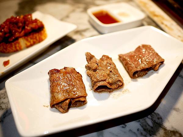 翼板切成薄長狀,捲起來享用口感非常有層次,乍看之下油脂很豐富,但入口相當清爽,烤肉師建議可以沾點玫瑰鹽或是水果燒肉醬都很提味,肉香氣十足又完全不油膩,咬下去肉汁直接在口中炸開,但卻不是厚重的油膩感,香氣十足超美味。