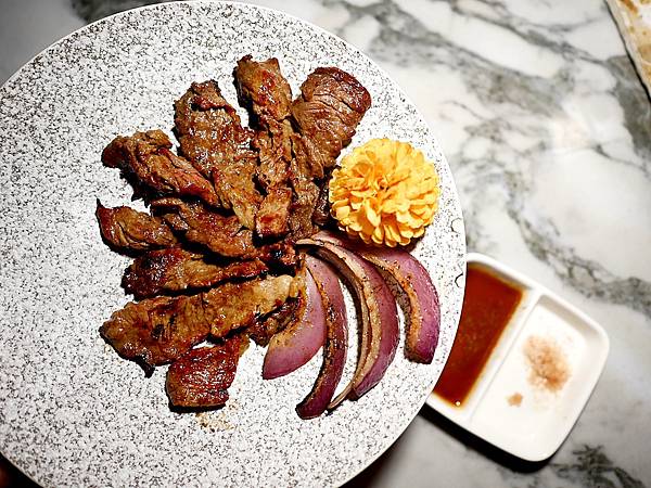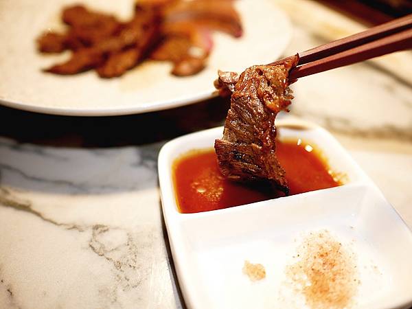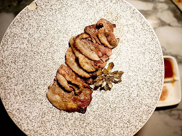 橫隔膜還不小塊,原以為是帶點嚼勁的口感,沒想到非常好咀嚼又軟嫩,完全不厚重,相當令人驚喜。因為烤之前有用燒肉醬醃漬過,吃起來非常清甜,單吃就很美味,再沾點玫瑰鹽或式燒肉醬都更添風味。