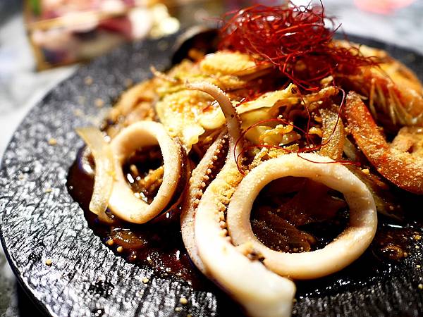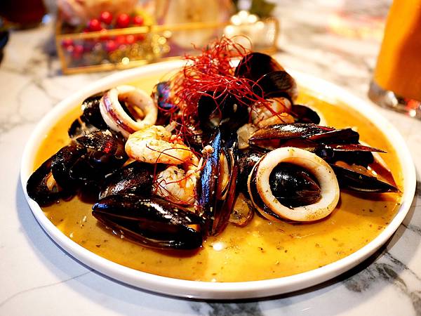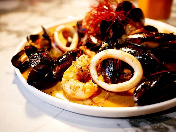 這盤好適合海鮮控,也是超棒的下酒菜,以白酒、洋蔥為主要風味來源,入口微酸香還帶點辣度,海鮮夠新鮮,吸飽醬汁每一口都很有味道。