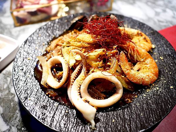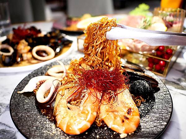 炒泡麵是使用韓國的泡麵,即使多放一下再享用口感也不會太爛超加分,醬汁的部分很鹹香但不厚重,拌著麵條、蔬菜、海鮮一起品嚐很夠味。