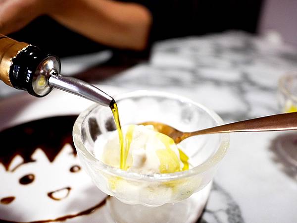 香草冰淇淋的味道很香濃,搭配是的香料鹽微微鹹很提味,鹽顆粒還不少,入口非常加分,淋上橄欖油之後,入口多了橄欖油的香氣,混著冰淇淋一起吃是陣陣青草味,相當有特色。這款不見得每個人都吃得慣,但特別的是加了橄欖油完全不會油膩還不錯。