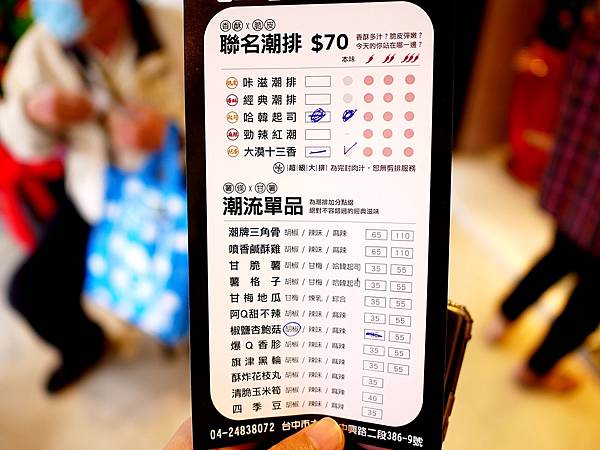 台灣炸物超多家,其中「潮麻吉」也算台中叫得出名號的雞排店之一,5月的時候大里中興路新開一家門市,看到有買一送一的活動立刻勾起處女座的精神,活動第一天就跑去排隊,只是活動跟我想像中的不太一樣,但還是順利買到雞排。「潮麻吉」的雞排共有五種口味可以選擇,其中又分成兩款麵衣,但麵衣的部分是固定搭配,無法客製化挑選我覺得小小可惜,有時會遇到想吃的口味剛好不是自己喜歡的麵衣,而「潮麻吉」的雞排調味相當濃郁,是重口系列的風味,比較適合重口味的朋友享用。