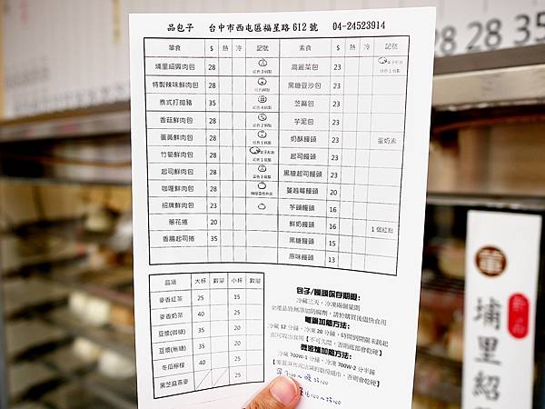 先附上價目表,「品包子」的菜單上貼心標註葷素,讓吃素的朋友可以立刻確認自己可以食用的範圍。此外,紙本菜單上還有針對口味的標記做圖示,即使買多種口味回家也不擔心混淆。