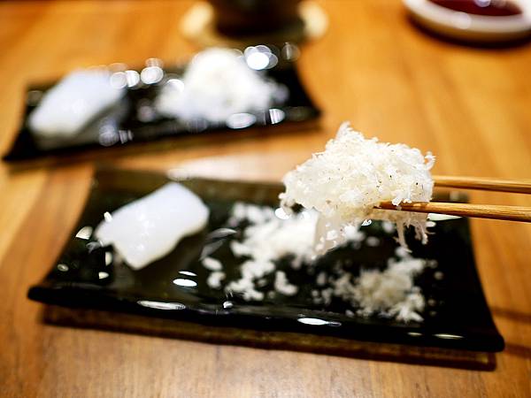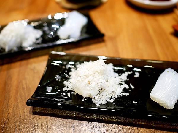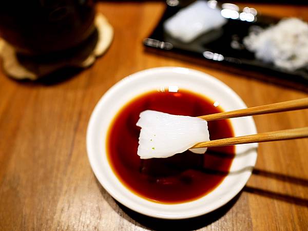 「味市お料理」的軟絲口感很棒,厚實度也非常剛好,吃起來雖然有油脂般的軟嫩感,卻不會讓人覺得厚重,是少數我能接受的生食軟絲。