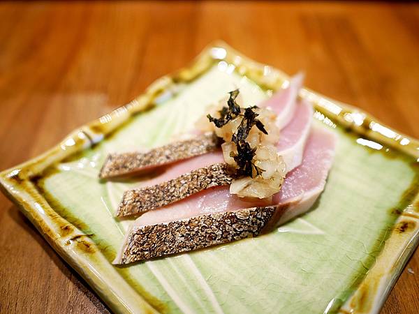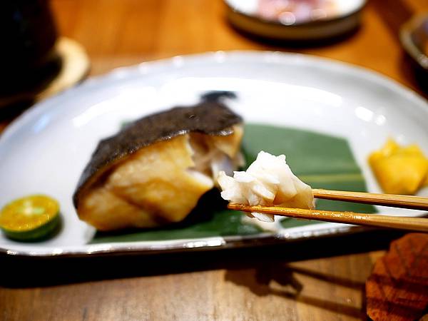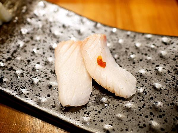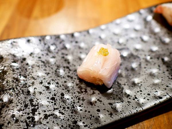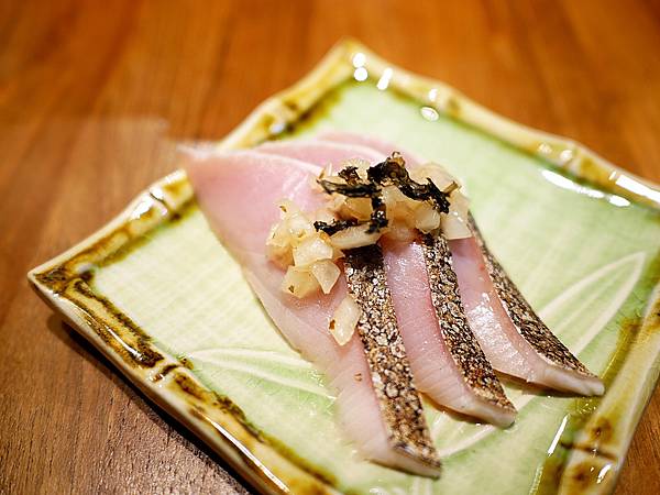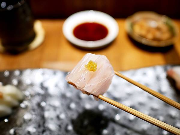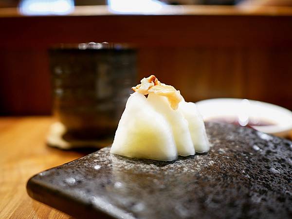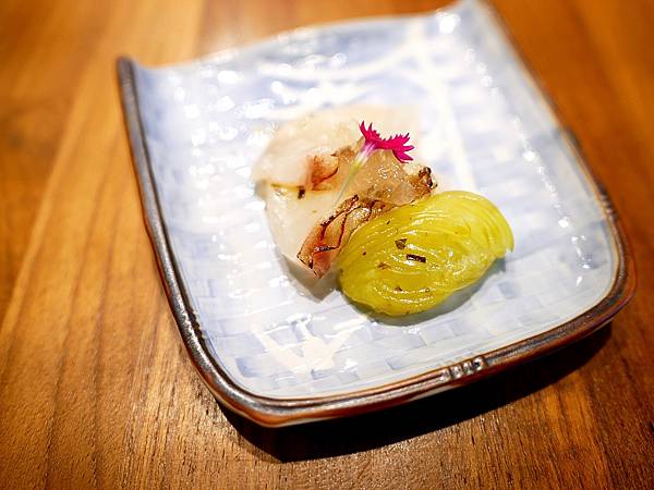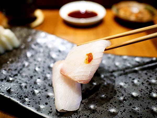 「間八魚」就是台灣常聽見的紅甘,魚塊捲起來口感更厚實,入口即化的感受更出色,軟嫩帶點油花感質地很美妙,上頭的柚子胡椒相當加分,完全不用加醬就好吃。