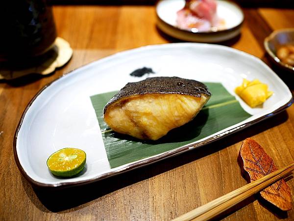 這塊「石喬」烤魚我超愛,魚的size還不小,肉質細緻鮮甜且吃法多樣化,記得先吃原味,接著沾點黑鹽,最後試試淋上金桔汁的滋味,看自己喜好怎麼吃都可以,也能搭配旁邊的梅漬南瓜憶起品嘗,都很讓人滿意。