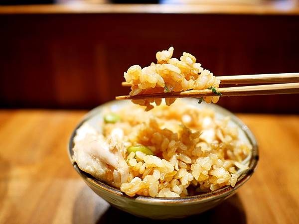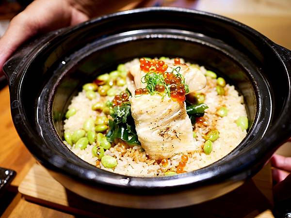 「釜飯」是菜單內的主食,經典日式傳統米飯料理之一,店家相當講究,就連釜飯的鍋子都是空運來台的。裡面搭配大量毛豆、鰤魚、昆布和主廚自己醃漬的鮭魚卵提升風味,食材的香氣完整被米飯吸收,每一口飯都是享受。