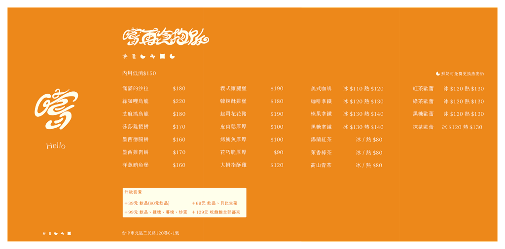 先附上菜單連結 : 菜單點我。內用低消150,飲料的部分提供免費更換燕麥奶,讓不能喝牛奶的朋友多了一項選擇。