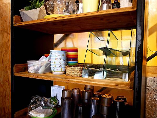 這邊大多是學生跟上班族,但老闆仍貼心替家庭客準備小朋友使用的餐碗、叉匙,讓爸媽外出不用大包小包。店裡採半自助式,餐具、醬料都放在樓梯口的架子上,讓顧客自行取用。