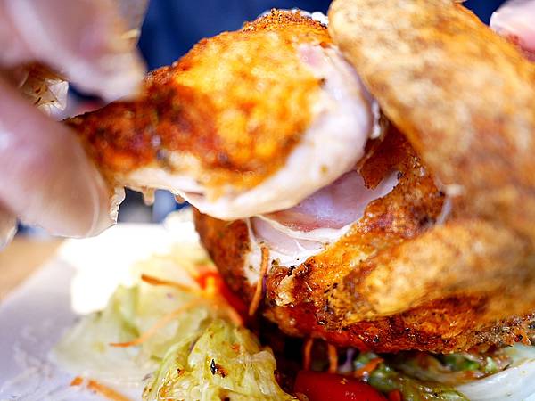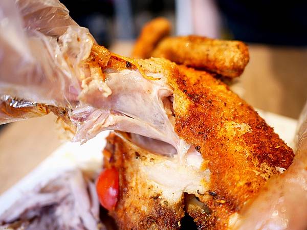 春雞還不小隻,烤到酥脆的春雞光看就覺得相當入味,上頭鋪了一層起司有點像是雪花超美的。先炸後烤的手法把肉汁完整鎖在肉裡,撥開的瞬間肉汁立刻流出來有夠狂,中間還飽含了大量雞汁,很少遇到這麼juicy的烤雞。