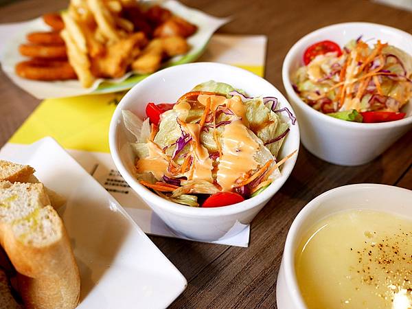 沙拉還不小份,生菜新鮮脆口而且種類豐富不單調,搭配的醬汁以油醋風味為主,還帶點千島醬的香,氣很特別卻不違和,酸香開胃非常清爽。