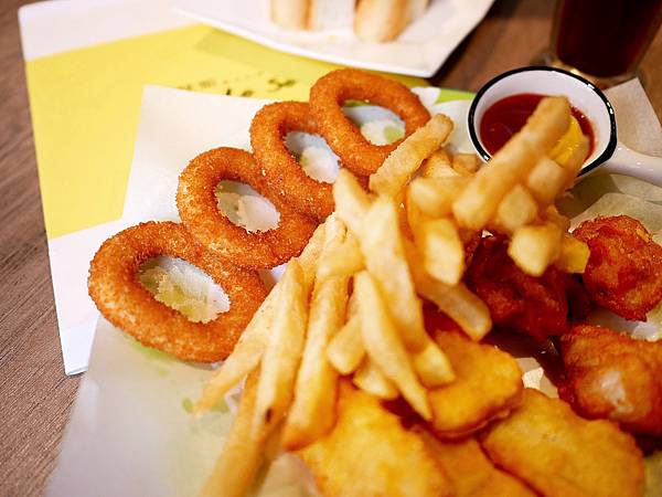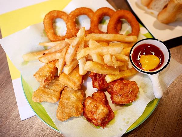 炸物拼盤有薯條、雞塊、唐揚雞和洋蔥圈,炸物的油都瀝很乾,吃起來不會太厚重,趁熱享用口感非常酥脆,其中唐揚雞的調味很有特色,帶點啤酒香不用沾醬就很夠味,整體份量還不小很適合多人分享。