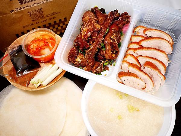 這個套餐的內容包含四分之一隻片皮鴨、鴨棧鹽酥鴨架、厚功鴨味粥,以及基本都會搭配的餅皮、甜麵醬、蔥段、泡菜和辣粉,喜歡怎麼吃就看自己的搭配。就一人份的餐點來說,種類還算豐富。