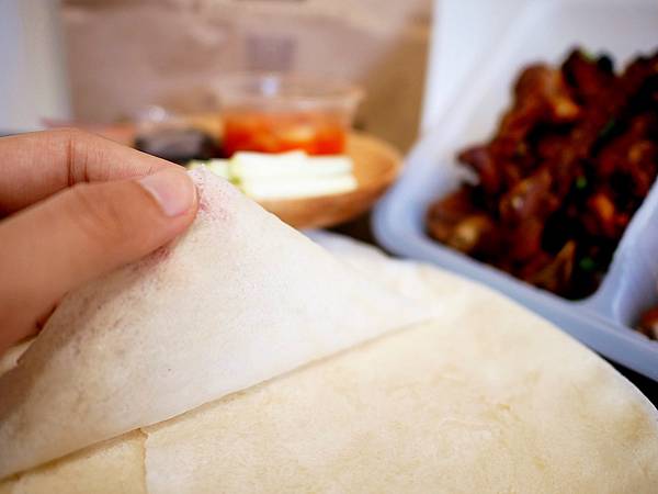 麵皮也是影響烤鴨捲餅是否好吃的關鍵因素,如果太厚或太乾都不好吃,鴨棧的麵皮還挺薄透,能把烤鴨和蔥段完整包裹,即使接觸到甜麵醬也不易破,細細咀嚼還能吃到淡淡麵粉香我喜歡。
