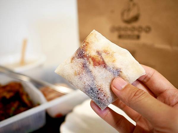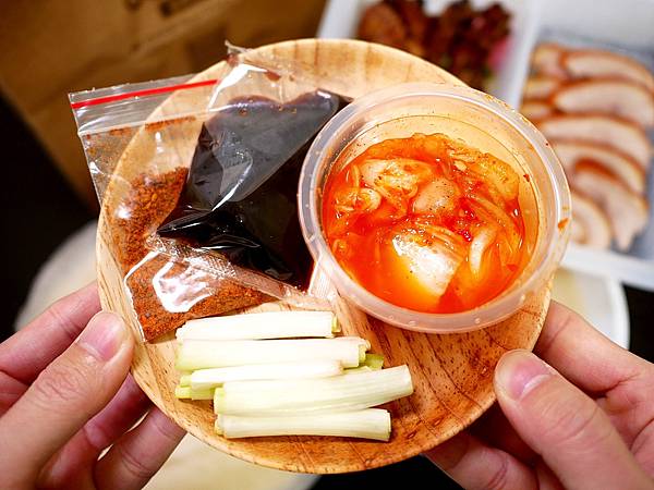 一般附甜麵醬和蔥段是標配,鴨棧還多送了人氣很高的韓式泡菜跟辣粉,對夾在麵皮內一起吃,更添層次感。