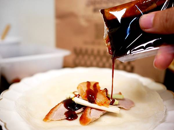 靜香小時候不管吃什麼都少不了調味料,長大後口味變清淡,很多醬料都戒掉了,唯獨甜麵醬每次看到都加滿滿,鹹甜回甘的滋味怎麼能不加爆,鴨棧的甜麵醬給不小包,六份烤鴨捲餅包完還有剩,吃起來不會太鹹真的很提味。
