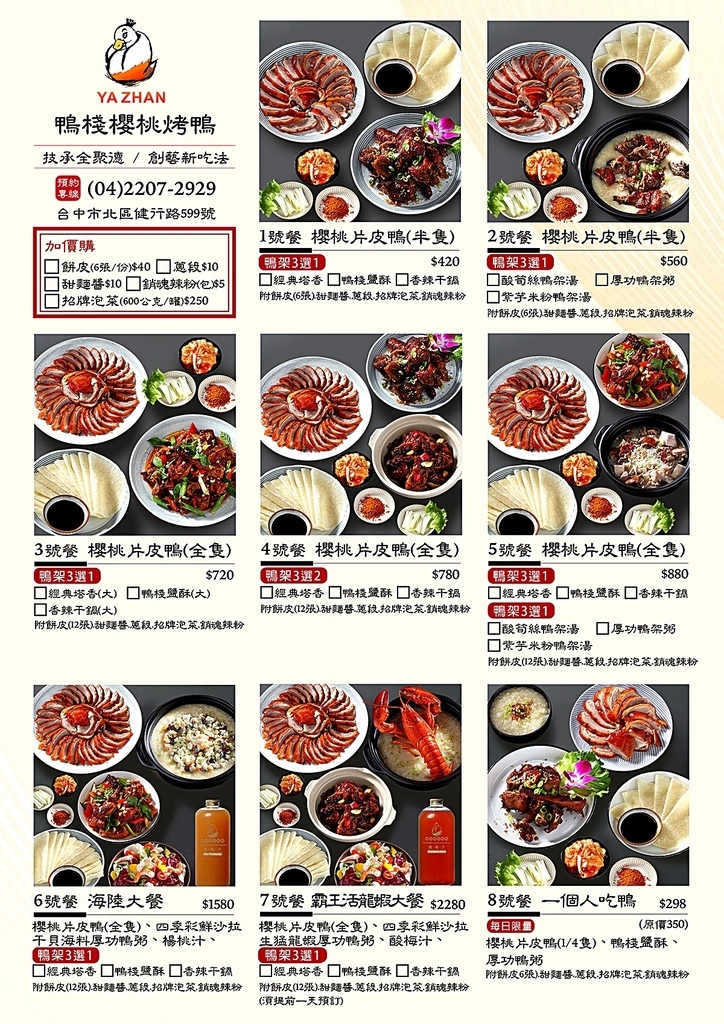 先附上菜單,看不清楚可以點連結查看,菜單點我。「鴨棧櫻桃片皮鴨」從常見的半鴨、全鴨到單人餐或澎湃的海陸全餐通通都有,除了單人餐沒有客製化挑選的部分,其他餐點都能自由選擇鴨架的料理方式。