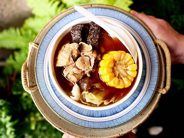 麻油雞的香氣很不錯,雞湯香醇甘甜,還能喝到高麗菜煮出來的蔬菜甜味,裡面有4大塊帶骨雞腿肉、玉米、米血、菇類和滿滿高麗菜,份量還不少。雞腿非常軟嫩一點也不乾柴,吸飽湯汁還帶點酒香味真的好吃,高麗菜沒有煮到太爛,保留脆度和甜味超合我胃口。