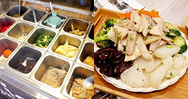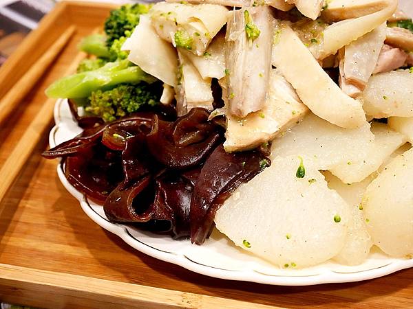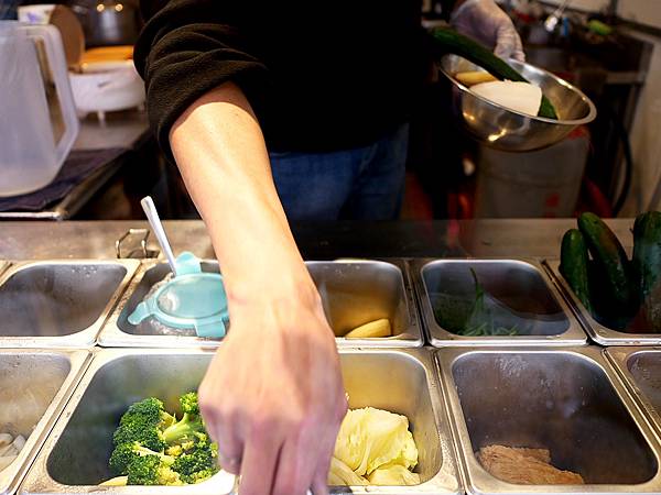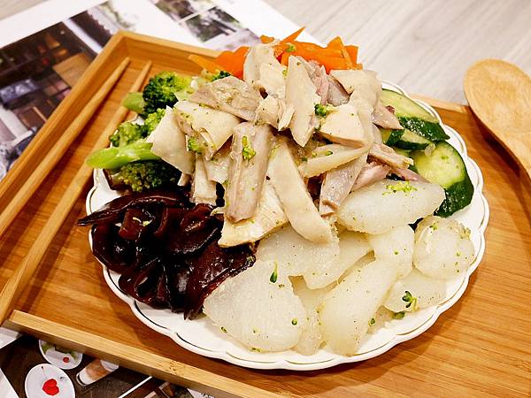 「益Yicun蔬食鹹水雞」提供10多種蔬菜讓顧客挑選,蔬菜看起來都很新鮮翠綠,相當引人食慾。靜香等餐的時候有觀察到冷藏櫃內以青菜為主,頂多有豆包和雞冠,詢問後才知道老闆希望提供清爽健康的餐點給顧客,所以拋棄受歡迎的雞心、雞胗等等,雖然靜香也很愛吃內臟,但內臟的確對身體比較有負擔,老闆的取捨還挺勇敢。