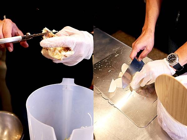 鹹水雞的蔬菜大家都挑什麼呢? 靜香專門選大份量或吸湯的,像是黃瓜、蘿蔔等等,這樣吃起來比較過癮,最愛大口吃飽含湯汁的蔬菜。只見老闆快速把蔬菜切塊,並將雞肉去骨剪小段,動作很有效率。