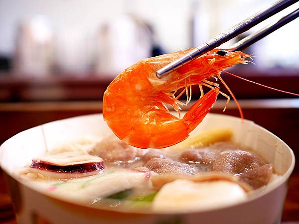 「益Yicun蔬食鹹水雞」的鍋燒麵湯頭跳脫一般用柴魚當湯底,改用雞骨和雞肉熬煮的雞湯,味道有點像豚骨香氣,但湯頭不油膩還能品嘗到雞湯的風味我喜歡。配料還不少,雞蛋、肉片、蝦子、花枝圈等等,蝦子很新鮮且肉質Q彈甜度高。烏龍麵沒有煮到太爛,麵條包裹著雞湯的香氣還挺好吃,如果你跟靜香一樣喜歡雞白湯,很推薦可以試試。