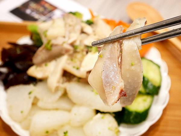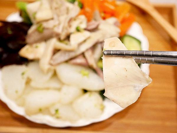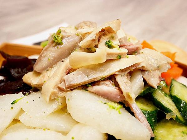 雞肉的皮很脆而肉質有咬勁但不乾柴,肉有點像土雞的口感,比較不似一般肉雞。調醬鹹甜回甘還帶有蔬菜的湯汁在裡面,蔬菜細緻新鮮,比較吸湯的種類包裹些許雞汁味道超棒,而黃瓜、甜椒等則以爽脆口感深受歡迎,脆口鮮甜一樣很美味。