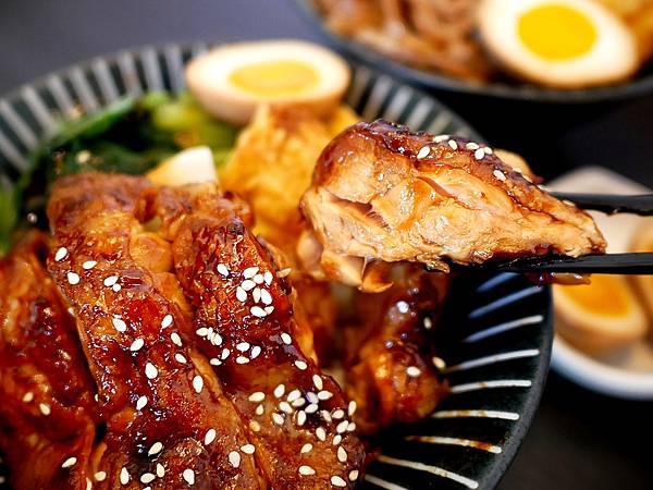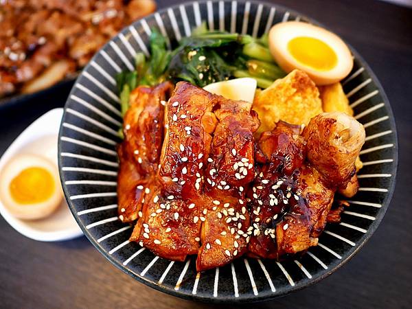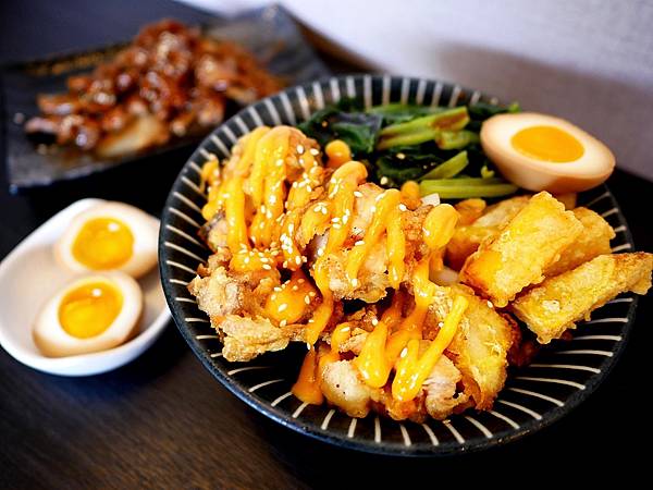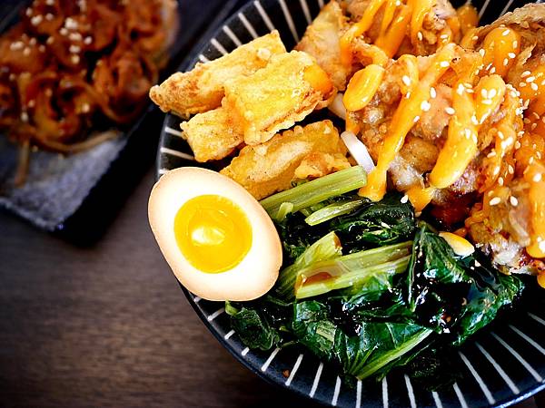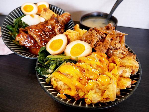 當天跟男友點了一個烤雞腿和唐揚雞+豬梅花的雙拼,每份丼飯除了肉食、米飯之外,還有半顆溏心蛋跟青菜、炸地瓜薯條、漬蘿蔔,不確定是不是每天都相同。丼飯的份量我覺得剛好,但對男友來說偏小碗,食量大的朋友點餐時記得加飯,也能多點碗湯或肉食來增量,會更有飽足感。