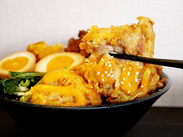 雙拼的豬梅花藏在下面,要挖出來才看得見,但上頭的唐揚雞不少塊,而且每塊雞肉都不小,麵衣金黃很誘人,不是非常酥脆的口感,記得趁熱吃麵衣口感最佳,雞肉相當厚實而且很軟嫩,調味也很剛剛好,沒有蓋掉雞肉的香氣蠻好吃,淋上帶點微辣感的特製沙拉醬意外不膩口,不過我還是喜歡醬汁再少一點,吃起來會比較清爽,下次去吃要請老闆下手輕一些XD。