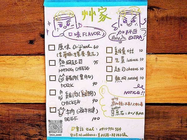 先附上菜單,「艸家煎餅果子」的口味不算多,原味是基本配料,其他口味則是在原味之上加入選擇的肉食,可以選擇要不要蔥花和加辣。撰文的時候才留意到,竟然沒有加薄脆的選擇,這是一定要加爆的吧!