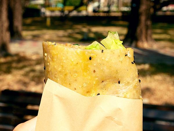 「艸家煎餅果子」的餅皮蠻薄,吃起來像略帶嚼勁的薄蛋餅皮,跟在「老大爺煎餅果子」吃到的不太一樣,後來才想到應該是軟硬面之分。軟面雖然沒那麼酥脆,但口感不會乾、香氣也不錯,特別是上頭的芝麻香超加分,但有種吃蛋餅的既視感XD