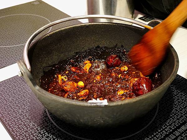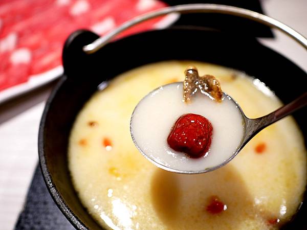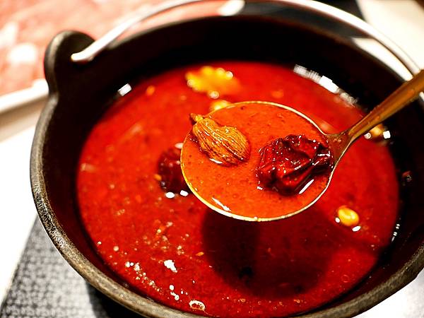 這款湯頭會桌邊現炒,先加入牛油再搭配滿滿辣椒、香料去炒香,最後補滿濃郁豚骨高湯讓風味更有層次,湯的辣度還不低相當過癮,大約是中辣程度,但入喉不會太刺激,尾韻的辣度相當持久,是滿順口但又夠辣夠味的麻辣湯,用來涮肉超對味!