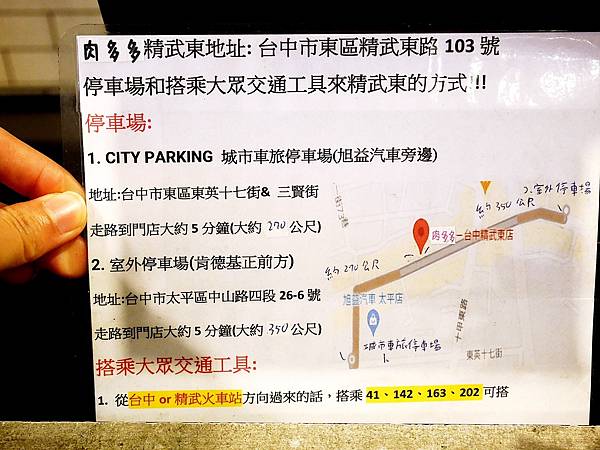 靜香在櫃檯拍到肉多多太平店的交通資訊,有興趣的朋友可以參考,附近還有停車場相當方便。